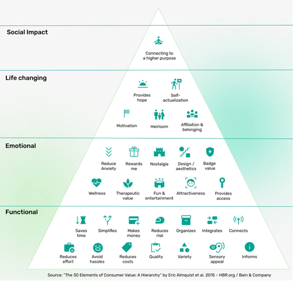 An organization that is able to continuously innovate and add value has a competitive edge. But what kind of values should you consider? You could, of course, think of price, quality, or specific specifications. While these functional aspects are important, subjective and personal considerations also play a role. Fortunately, research has been conducted on the values that matter in the consumer market. This research by Bain Company offers tools for building a strong consumer proposition. The 30 value elements are divided into a pyramid with five categories.